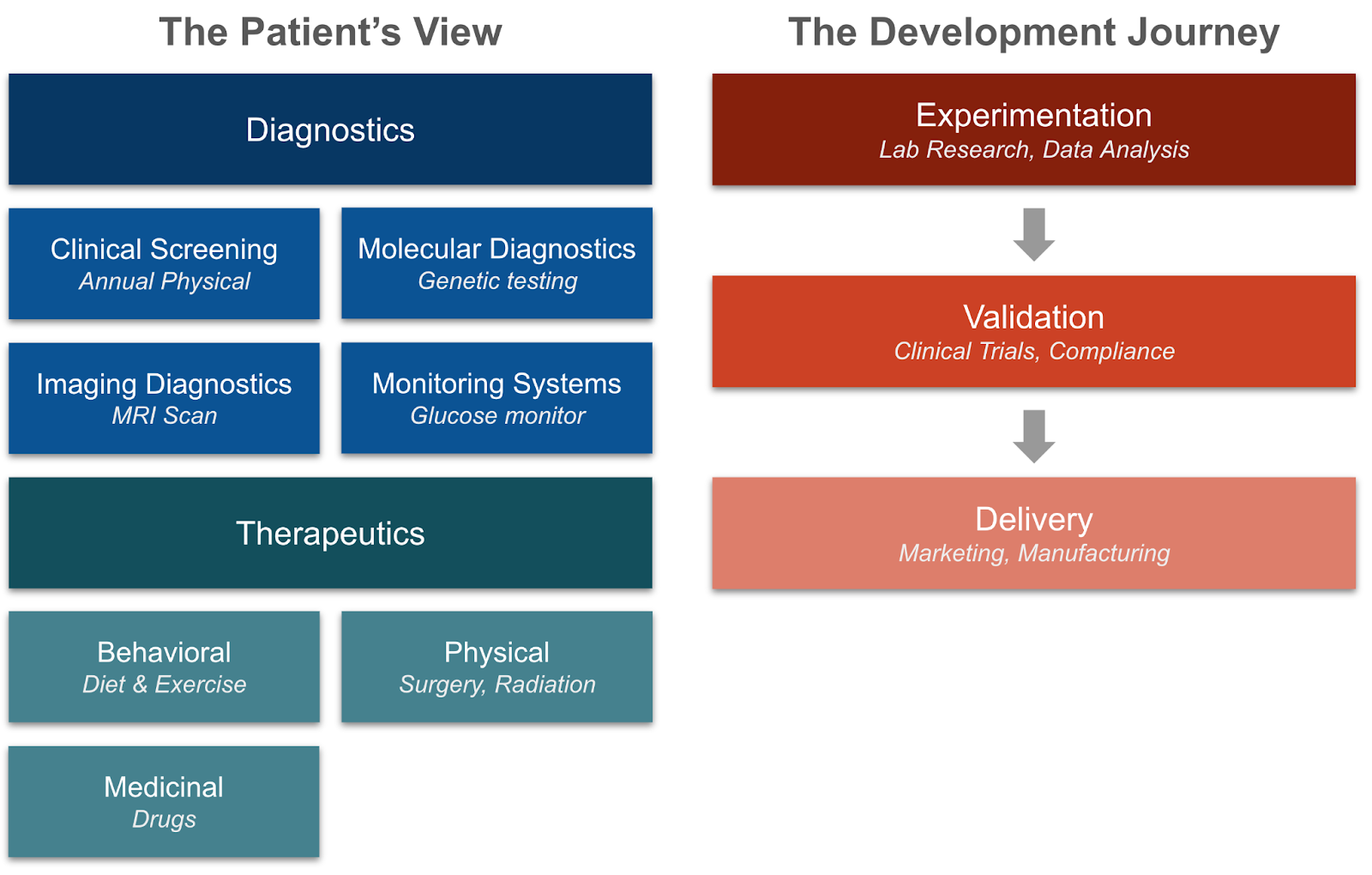 If diagnostics and therapeutics are the products being delivered, how are they made? The development lifecycle follows a path from experimentation, to validation, to delivery.
